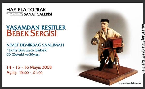 Nimet Demirbağ Sanlıman, 14, 15 ve 16 Mayıs 2008 tarihlerinde Bursa’da bulunan Hay’ela Toprak Sanat galerisinde eserlerini sergileyecek ve bir slayt gösterimi yapacak. Hayranlarının kaçırmaması gereken bir buluşma bu :)