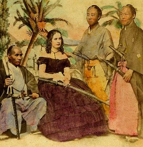 Amerikalı ilk kadın samuray, üstelik, makyajı ve son moda kıyafetiyle. Omuza dayanmış el belki de o Japon samurayın kocası olduğunu gösteriyor. Yani burada bir öykü var. Bugün olsa Ayşe Arman atlar gider röportaj yapardı :)