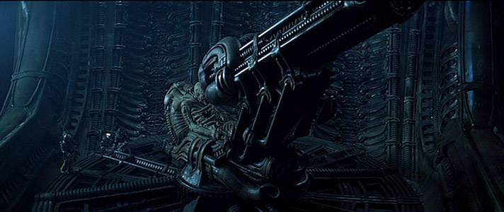 queen_alienpress_still01 Öncelikle bu hayvanı tasarlayan H. R. Giger‘dir ve filmin yönetmeni de Ridley Scott. Çoğu kişi tarafından sağlam deli denebilecek kadar uçarı tasarımları olan Giger’in el çizimlerinde insanların başka bir gezegende buldukları dev bir zeki varlığın cesedi vardır. Cesedin karnı parçalanmış ve içinden Alien çıkmıştır. (Çizimin aynen canlandırıldığı sahneyi bulup aşağıya ekledim)