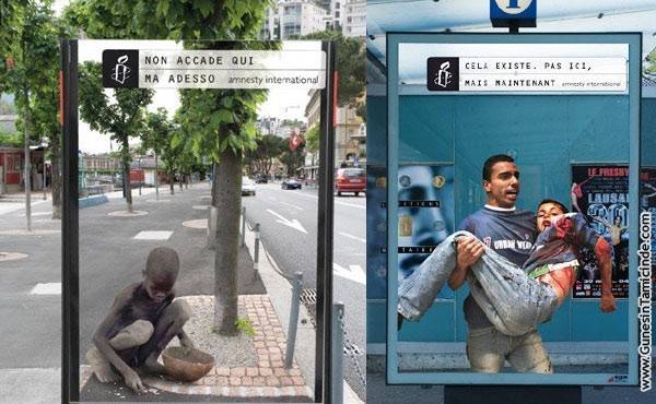 Bakmışlar olmuyor. Bir çok yerin fotoğrafını çekmişler. Sonra o fotoğraflara bu dünya sorunlarını eklemişler. Sonra bu yeni fotoğrafları afiş haline getirip tam doğru yere tabelalarla dikmişler. Açı ve mesafeniz doğruysa irkiliyorsunuz. Bir bakıyorsunuz bir Afrikalı hergün bindiğiniz otobüsünüzün yanında açlıktan bir deri bir kemik; bir adam köşe başında işkence görüyor, başları torbalı esirler çatılarda. Böylece görmemek için başınızı sürekli çevirmek zorunda kalıyorsunuz.