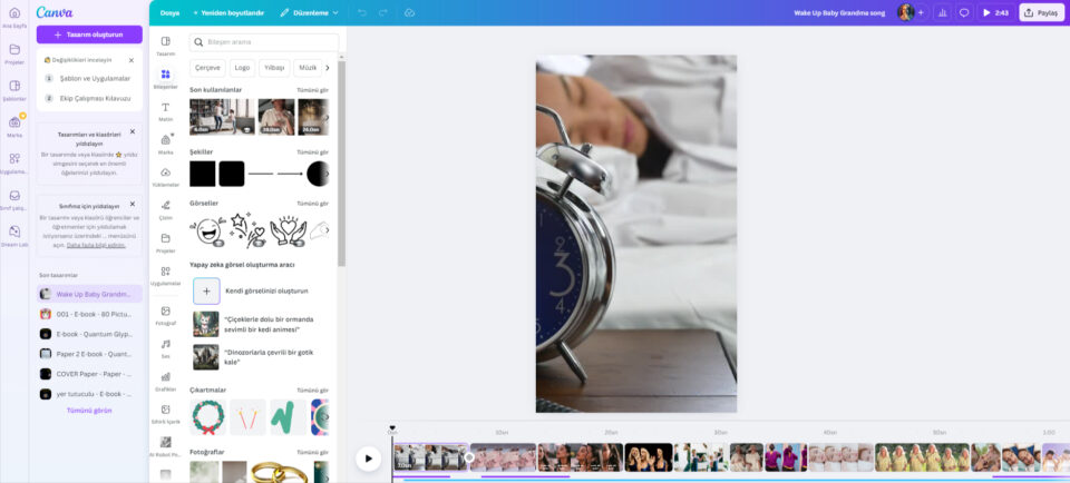Canva sitesinde https://www.canva.com/ Youtube ölçülerinde bir video başlattım. Şarkıyı siteye yükleyip timelineda alta atıp üstüne Soldaki bileşenlerde sözlere uygun videoları seçip kesip editleyerek hızla bu sonuca ulaştım. En başa çalan zil sesi vs.