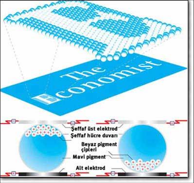 Bu noktalar ise yağ dolu çukurların içinde bulunuyorlar. Elektronik kağıda akım uygulandığı zaman bu noktalar istenilen rengi gösterecek şekilde bu çukurların içinde dönüyorlar.