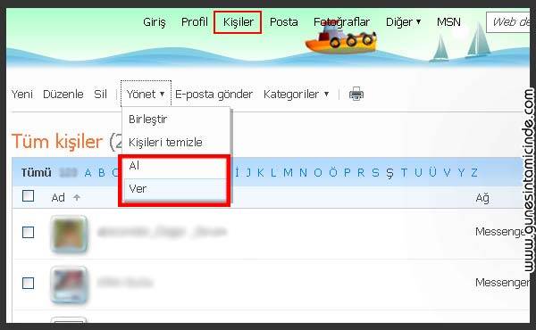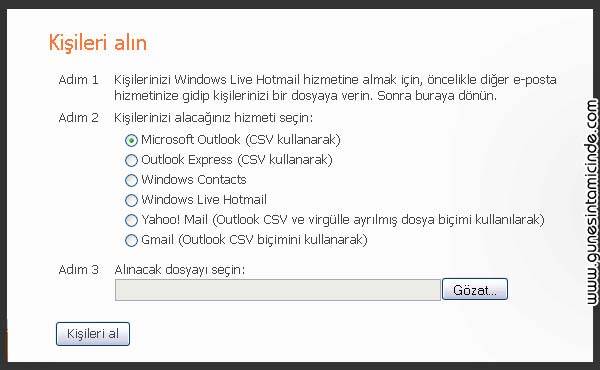 Eğer diğer bir e-posta servisinden CSV dosyası aldıysanız, yine yukarıda Kişiler ve Yönet menüsü ama bu sefer Al seçilir. Böylece isimler Hotmail’e aktarılır.