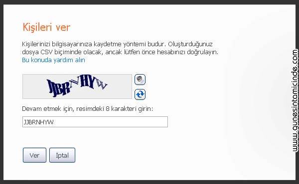 Kısaca en üstteki Kişiler menüsüne tıklanır. Yine üstteki Yönet seçilir. Açılan menüde Ver seçeneği tıklanır. Yeni bir ekranda güvenlik sorusu ile resimdeki harflerin aynısını yazmanız istenir. Bundan sonra Ver düğmesi ile tüm e-posta arkadaşlarınızı bir dosya haline getirip CSV formatında kaydetme hakkı verecektir.