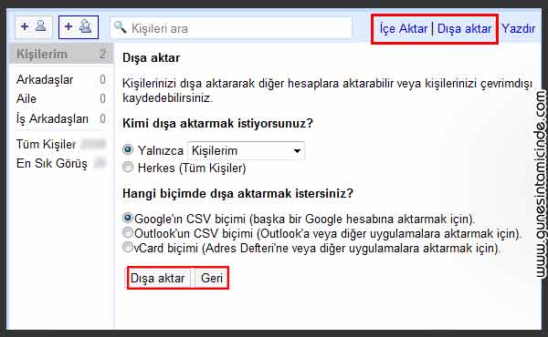 Solda kişilerim menüsünü seçin ve üstte Dışarı aktar başlığını tıklayın. Size CSV formatında bir dosya verecek. Böylece o dosyayı istediğiniz sisteme aktarabileceksiniz.