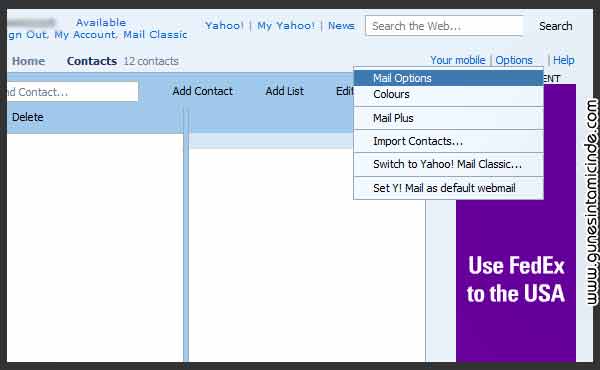 Üstte Options / Seçenekler tıklanır ve Mail Options seçilir. Açılan sayfada solda altta Contacts tıklanır.