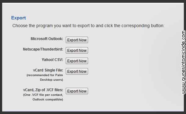 Üstte Options / Seçenekler tıklanır ve Mail Options seçilir. Açılan sayfada solda altta Contacts tıklanır. Contact Menüsünde Export, Dışarı vermek içindir. İstenen formatta bir dosya kaydedilir.