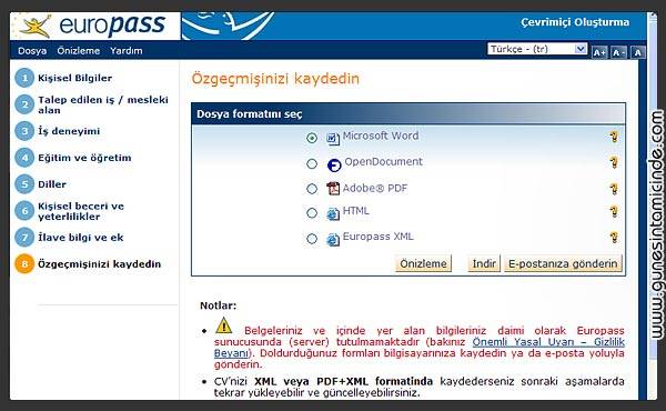 Resmi site: http://europass.cedefop.europa.eu/ sitesine girip Türkçe adımlarla da oluşturabiliyorsunuz. Bu güzel bir imkan. Aslında doğrusu amaç yurtdışına çıkmaksa bence İngilizce, Almanca tercih etmek daha iyi. Ancak CV bir Türkiye İnsan Kaynakları sistemine aktarılacaksa elbette Türkçe hazırlanmalı.