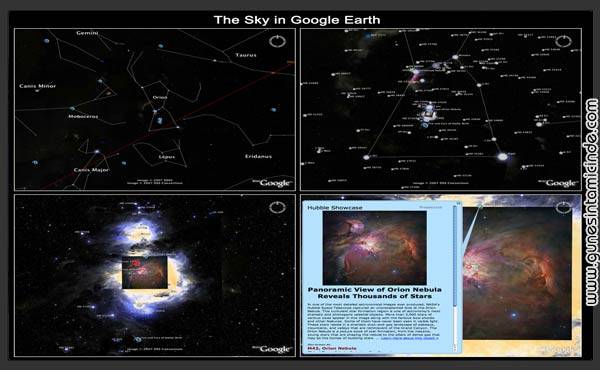 Google Earth kurulduktan sonra SKY özelliğini şöyle deneyebilirsiniz. View menüsünden Swirth to Sky seçin. Kamera, Dünya gezegeninden uzaya çevrilecek. Yavaşça takımyıldızların belirdiğini göreceksiniz. Şimdi tıklayarak ya da mousela sürükleyerek gezebilirsiniz. Ancak en pratiği Arama / Search kutusuna kelimeler yazmak. Mesela Sirius veya Pinwheel Galaxy gibi. Detaylı görmek için Layers panelinde “Constellations” , “Hubble Showcase”, “Planets” gibi başlıkları tıklayın gördükleriniz nefesinizi kesecek.
