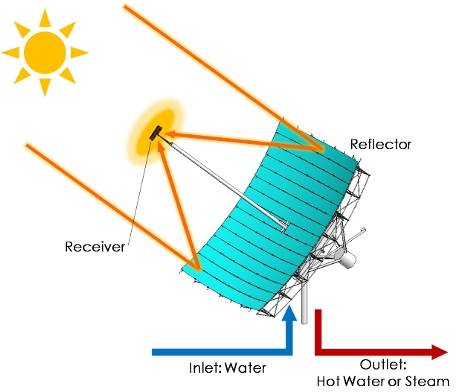 Güneş enerjisi odaklanarak, toparlanıp bir yüzeyi çokca ısıtması sağlanır. Buna büyüteçle bir ışığın toplanması gibi bakabilirsiniz. Ancak pahalı ve meşakkatli mercek sistemi yerine, kolayca ve ucuza bulunabilen parça aynalar kullanılması gün geçtikçe bağımsız araştırma grupları tarafından öneriliyor. Bu parça aynalar bildiğimiz çanak anten yüzeyine yerleştirilir. Öyle ki gelen ışık aynı çanak antende olduğu gibi merkezde alıcı da toplanır. Bunun sonucunda çok güçlü ışık ve sıcaklık kaynağı oluşur.