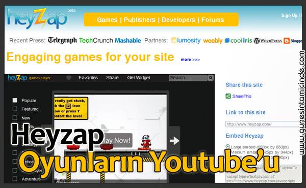 Videolar nasıl Youtube sitesine yollanıyorsa, Flash oyun geliştirenlerin de ürettikleri oyunları ekleyebilecekleri Heyzap isimli yeni oyun sistemi açıldı. Bunun anlamı oyunseverler binlerce oyunu tek bir ekrandan oynayabilecek ve site sahipleri oyunları sitelerine kolayca ekleyebilecek.