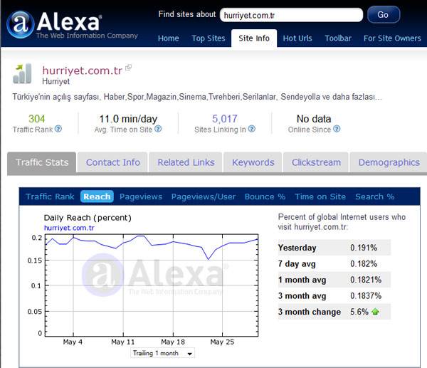 Hürriyet.com.tr Alexa istatistikleri için tıklayınız.