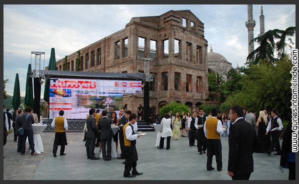 Ortaköy’ün denize nazır bir köşesinde Esma Sultan Yalısı’nda gerçekleşen gece, nezih ve enteresan bahçe düzenlemesini görmemle başladı. Enteresan olmasının sebebi Yalı’nın girişinden girdiğinizde sizi çeken kameraların arka bölümde notebook şeklinde kurulan platformdaki Hürrriyet Sitesi görüntüsünde orta kısımda göstermesiydi. Böylece gelen davetlileri görebiliyordunuz. Fotoğraf aşağıda.