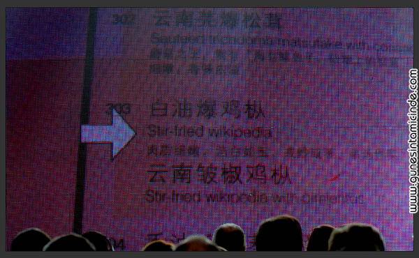 Arada esprili şeylerde gösterdi. Özellikle Çin’de Pekin’deki bir restaruantın menüsünde yer alan, kızarmış Wikipedia ve acılı Wikipedia fotoğrafı harikaydı :) “Sanırım birine, gir Wikipedia’da yemek tarifine bak, yap” demişler o da öğrendikten sonra yemeğin adını Wikipedia koymuş” dedi :)