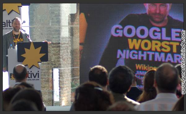 Wikipedia’nın kurucularından Jimmy Wales modern zamanların bilgi dervişleri gibi, maddiyatı hiçe sayan sade haliyle sahneye çıktığında, son derece zeki, esprili ve mantıklı bir insan olmasını beklemiyordum. Öyle ya, her yıl Wikipedia sayfalarına alabilecekleri reklam geliri yüzlerce milyon doları bulabilecekken ve kendi deyişiyle “Bugün özel jetiyle İstanbul’a gelebilecekken” bilgi özgürlüğü adına bunu kabul etmiyordu. Kısacası insanlığın hizmetinde olan bir insanla olağanüstü bir zaman geçirecektik.