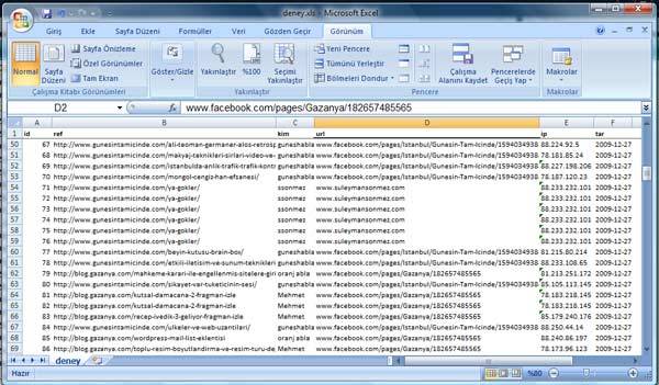 Siteye, Google’dan gelenlerin istatistik değerlerine kadın profili koyduğumuz hafta boyunca bakacaktık. Bu ziyaretçiler artıyor mu azalıyor mu? Daha çok sayfa geziyor mu? Daha çok yorum yapıyor mu? Sonra aklıma Facebook Hayran Sayfası geldi. Bu kadın profili (Günesh Abla) yazının sonunda “facebook grubuma üye olun” dese… İşe yarar mı? İşte tam bu noktada Mehmet devreye girdi. Yazdığı program çok akıllıcaydı. Eğer bu link tıklanırsa gidip bir veritabanına kayıt yapıyordu. Şu saatte şu IP numarasına sahip ziyaretçi sitedeki şu sayfayı okurken gelip sitedeki kadın ya da erkek profilini tıkladı şeklinde. Cidden çok yerinde ve zekice bir taktikti bu. Aşağıda örnek bir çıktı görüyorsunuz.