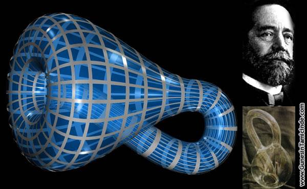 “Şimdi ne oluyor yani bu ne şimdi?” diyenlere açıklayalım. Dikkatli bakınca iki tane giriş var ve iki tane son var. Ama tanımladıkları kapalı bir alan. Sonsuz bir kendi kendisine dönüş var ancak yine de çember gibi değil bir akış var. Bu şekli araştıran kişi Alman bilim adamı Felix Klein (1849-1925).
