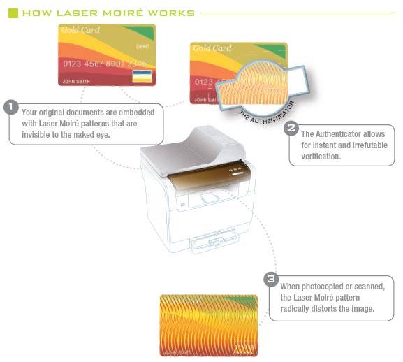 Bu sefer moiré eğrileri oluşturmak için lazer kullanılıyor. Güvenliği oluşturan etken ise görüntü scanner/tarayıcı ile tarandığında şekil karıştığından aynısı elde edilemiyor. Bu çıplak gözle görünmeyen başarılı bir koruma şekli. Holografik etiketleme bir kartın ya da değerli belgenin orijinalliğini de destekliyor. Aşağıdaki şekilde de anlatıldığı gibi birisi hologramın kopyalanmasına uğraşırken baskı aldığında normalde bu gözle görülmeyen çizgilerin görüntüyü kapladığını görüyor.