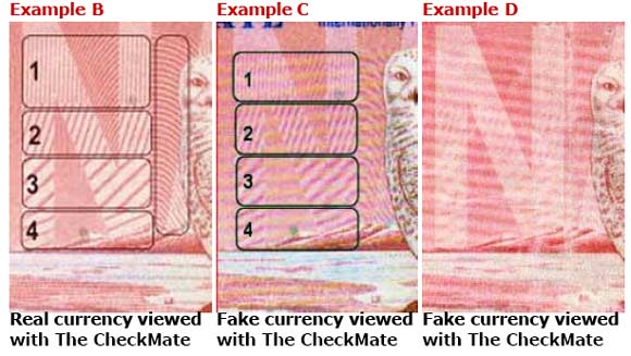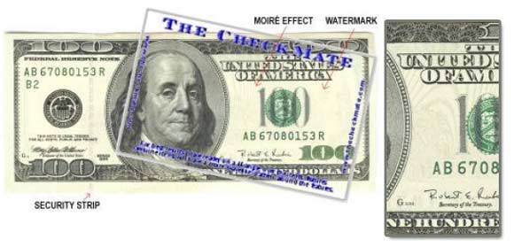 Internetten bulduğum enteresan bir ürün var. İsmi CheckMate olan ürün akrilik lens (acrylic lens) kullanıyor. Patentli ürün paranın üstünde gezdirildiğinde paranın üzerindeki bu eğerilerdeki moiré efektini görünür kılıyor. Böylece sahte para ile gerçek para birbirinden ayrılabiliyor.
