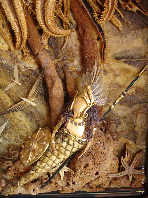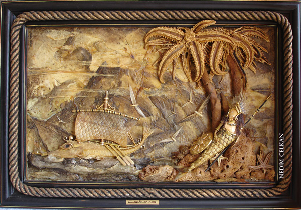 Celkan: Hem resme giriyor, hem heykele giriyor. Ben de buna isim babalığını bulamadım. Birini tanıdım ne diyelim buna dedim “Su ürünlerinden sanatsal yapıtlar dersin” dedi. Öyle kaldı.