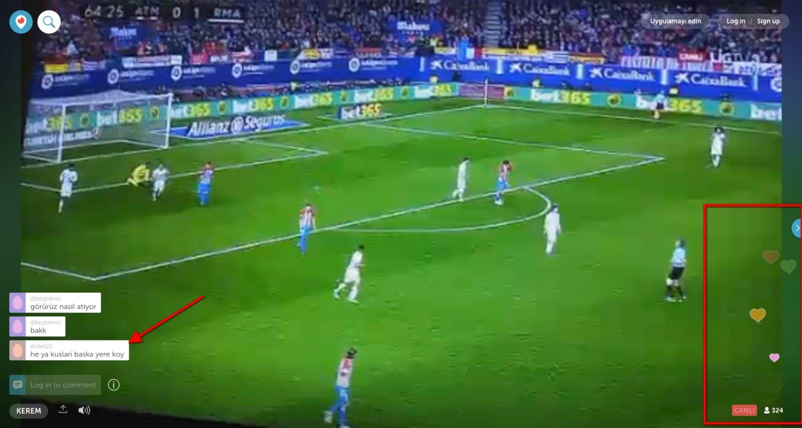 Online canlı yayın yapan sitelerde en çok rastlanan sorun telif hakları oluyor. Örneğin bir TV platformu canlı futbol maçı yayınlarken cep telefonunu televizyonuna doğru konumlandıran herkes yayını paylaşarak para kazanmaya çalışabiliyor. Aşağıdaki görüntüde çok güldüm. Meğer maç yayını yaparken o odada kuş varmış. Ötünce izleyiciler habire yazıyorlar. Kuşu içeri götürün diye. İzleyicilerin bir kısmı da korsan seyir sırasında sürekli bir şeyler buyuran diğer izleyicilere kızıyor. Sağda ise teşekkür kalpleri uçuşuyor.
