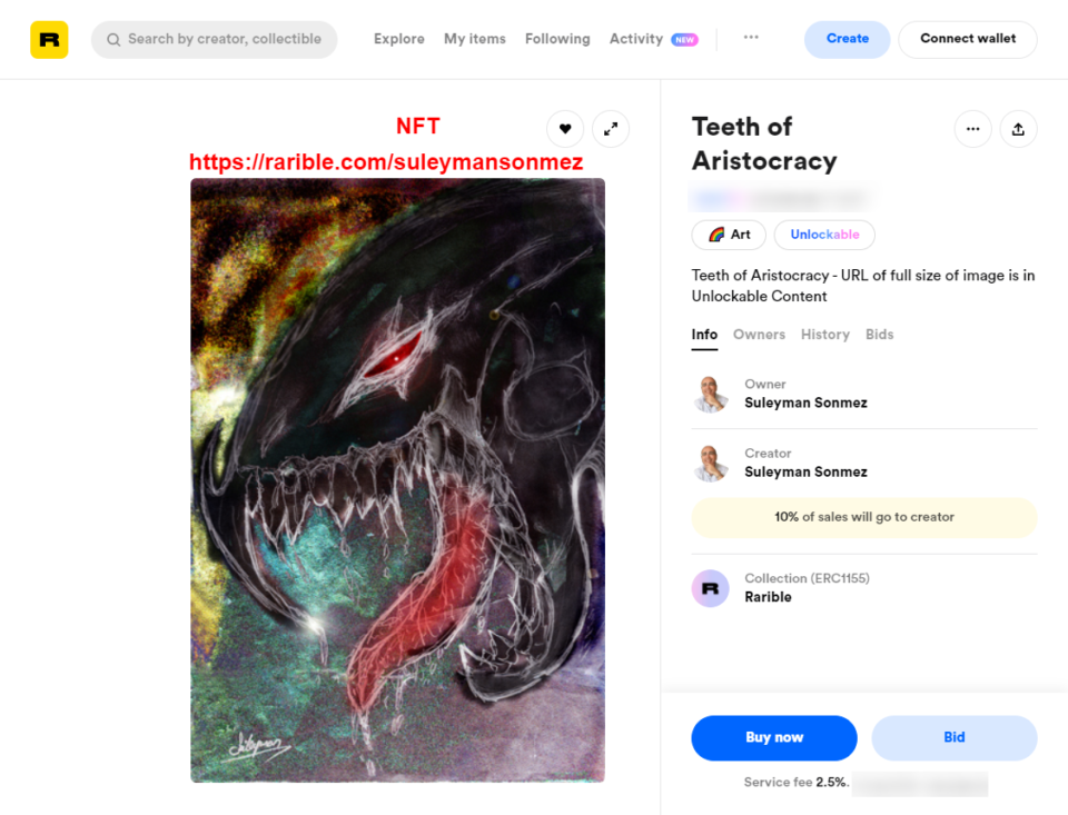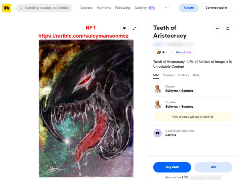 Rarible sitesinde. “Aristokrasinin Dişleri” “Teeth of Aristocracy” adlı NFT eserimin satın alma linki: