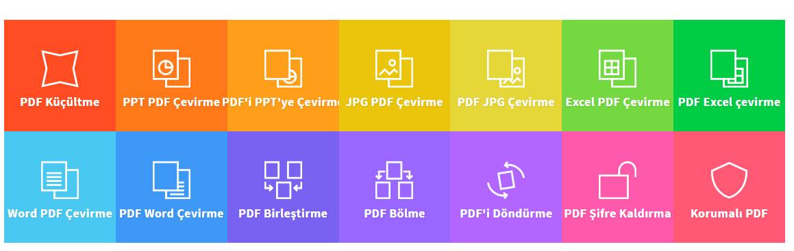 PDF Küçültme, PPT PDF Çevirme, PDF’i PPT’ye Çevirme, JPG PDF Çevirme, PDF JPG Çevirme, Excel PDF Çevirme, PDF Excel çevirme, Word PDF Çevirme, PDF Word Çevirme, PDF Birleştirme, PDF Bölme, PDF’i Döndürme, PDF Şifre Kaldırma, Korumalı PDF