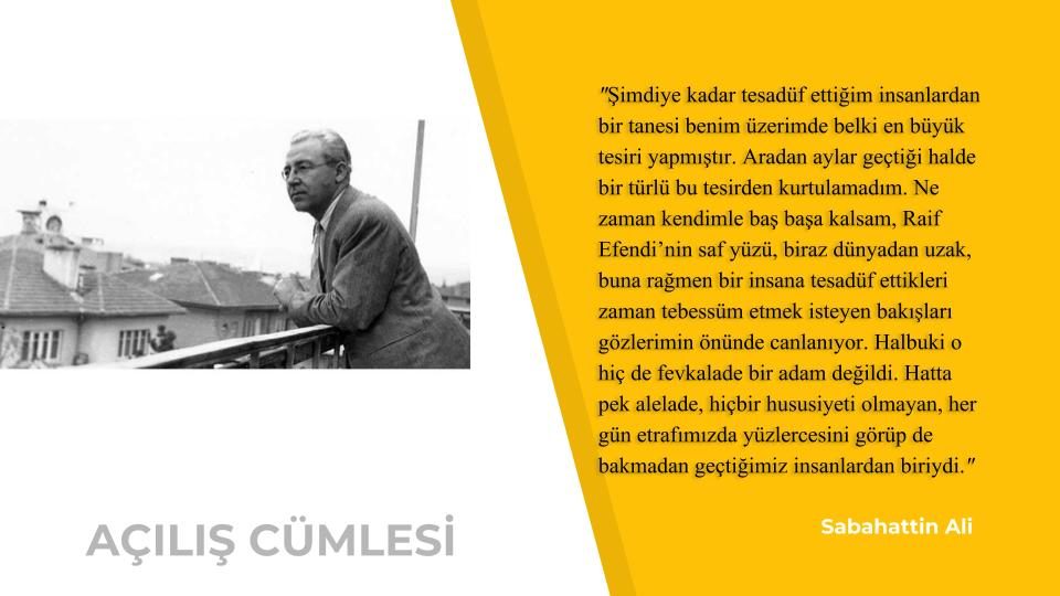 Raif efendi, tekrar dudaklarını kımıldattı. Duyulur duyulmaz bir sesle: “Seninle hiç şöyle uzun boylu konuşamadık evladım… yazık” dedi ve gözlerini kapadı.