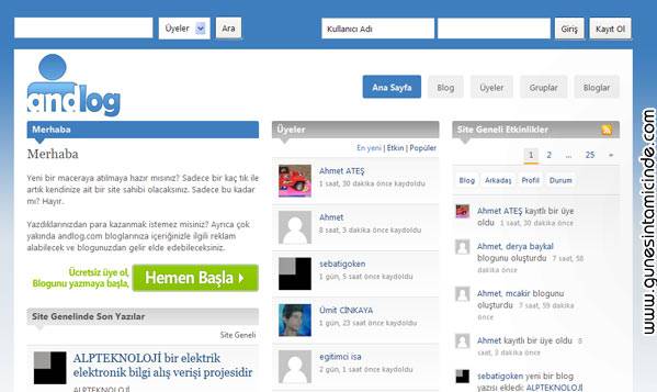 Yine bir dostum Hakkı Ceylan sizler için yeni bir blog açma sitesi hazırladı. İsmi Andlog. Yani kendi sitenizi ücretsiz şekilde ve Türkçe açabiliyor, görünümünü değiştirebiliyorsunuz. Sistem altyapı olarak WordPress MU’yu kullanıyor. Ayrıca sitede güçlü bir sosyal ağ yapısı da var. Diğer kullanıcıları takip edebiliyorsunuz.