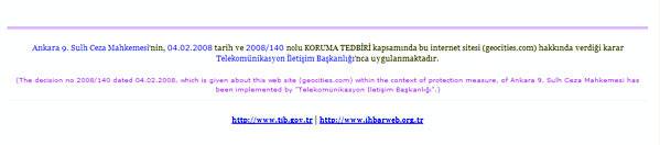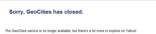 “di’li geçmiş zaman”, gerçeği haykırıyor. Yahoo hisse senetlerinin değer kaybı ve zamanında Microsoft’un satın alma teklifine “hayır” demesinin acısını çekiyor. CEO’nun gönderilmesi bile durumu çözmedi. Kriz Yahoo’nun bu güzelim siteyi kapatmasına neden oldu. Milyonlarca altsite kapandı gitti. Hoş Türkiye dünyanın en tatlı sansür ülkesi olarak(!) o milyonlarca sayfadan sadece biri nedeniyle tümünü koskoca ülkeye zaten yasaklamıştı ama ne gam. Halen www.geocities.com girdiğinizde aşağıdaki ibareyi görebiliyorsunuz. Birileri görevlileri uyandırmalı.