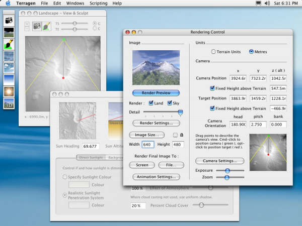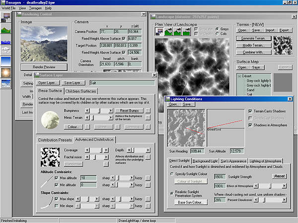 Terragen çok başarılı ve kolay kullanımlı bir yazılım. Görevi 3 boyutlu arazileri, denizleri gölleri vs tasarlamanızı sağlamak. Arabirimde gerekirse adınıza sıradağlar bile yapabiliyorsunuz.