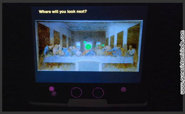 En sevdiğim bölümlerden birisi yine buradaydı. Son Yemek tablosunda sizin ilginizi tablonun nereleri çekti? Bir bilgisayar ekranı karşısında oturuyorsunuz ve önce baktığınız yeri gösteriyor ve kırmızı bir daireyi ekranda gözle takip etmenizi söyleyerek kalibre ediyor. Sonra tabloya bakıyorsunuz.