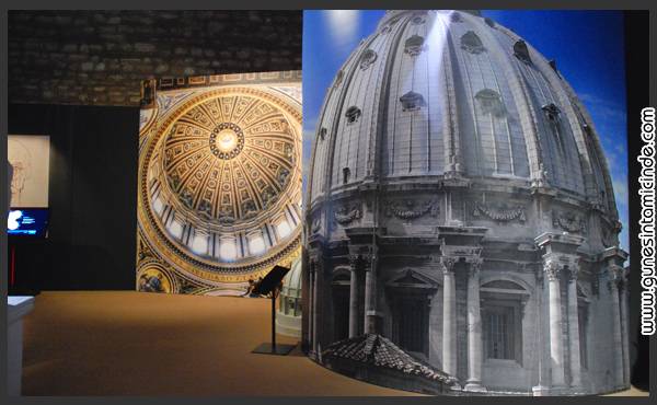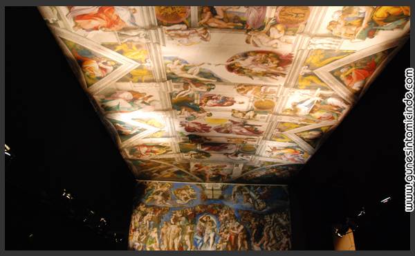 Elbette uzun uzun seyredilebilecek bir diğer yer de Sistine Şapeli’nin ölçeklendirildiği kısım. Büyük ressam Michelangelo çok zor şartlar ve baskı altında senelerce tavana bakarak ve vücudunu zorlayarak yapmış bu 540 metrekarelik eserini. Eğer kutsal kitapları okuduysanız semavi dinlerdeki ortak anlatımları kolayca tanıyacaksınız. Tanrı’nın ışığı Karanlık’tan Ayırışı , Güneş ve gezegenleri Yaratışı, Tanrı’nın Su ve Toprağı Ayırışı, Adem ve Havva’nın Yaratılışı, Cennetten Kovuluşları, Nuh Tufanı gibi… (Resimlerin planı şurada: http://upload.wikimedia.org/wikipedia/commons/4/4a/Sistine_Chapel_ceiling_diagramA1.PNG)