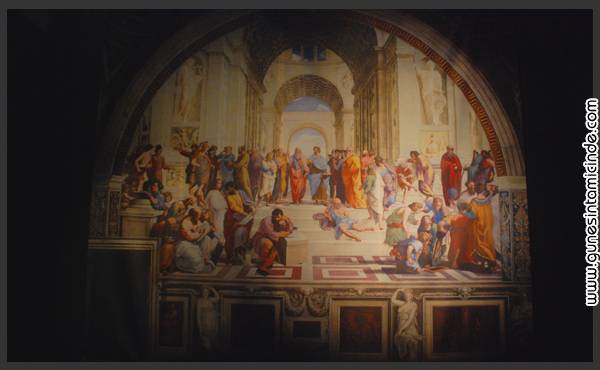 Unutmadan Raphael biraz daha sönüktü sergide bence. Leonardo daha önde duruyordu. Ancak yine de keyifle “Atina Okulu freski” karşısında zaman geçirdim. Biliyorsunuz tabloda zamanının ünlü isimlerini eski kimliklerin yüzü olarak çizmiş hatta kendisini de :)