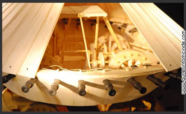 Daire şeklindeki, hareket eden tankın atası sayılabilecek toplu araba mı dersiniz, çok uzağa gülle fırlatabilen mancınık mı, son ana dek balıkçı teknesi gibi görünen ama birden üst kapağı açılıp içinde saklanan topu ateşleyerek büyük gemileri batırabilen gemileri mi dersiniz, matbaanın ilk hallerini, su değirmeni ile çalışan testereyi, dönen çarkları ile düşmanı biçen savaş arabalarını, enteresan köprü modellerini…