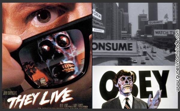 They Live filiminde benim en sevdiğim sahne, elemanın taktığı gözlükle, reklam panolarına ve televizyona ve dergilere ve paraya bakması, görünenin ardındakini görmesi…. Yani tüm bu şeylerin asıl mesajına vakıf olması… Bu mesajlar: İtaat et, tüket, otoriteyi sorgulama, teslim ol… türünden şeyler. Ve paraya bakınca da, onun üstünde, “Bu senin tanrın” yazdığı görülüyor. Bu film, kapitalist sistemi gayet iyi anlatıyor –insana çok değer veriyor görünüp hiç değer vermeyen, ona düşman olan bu sistemi… Ama kapitalist sınıfın yerine, uzaylıları geçirmiş.