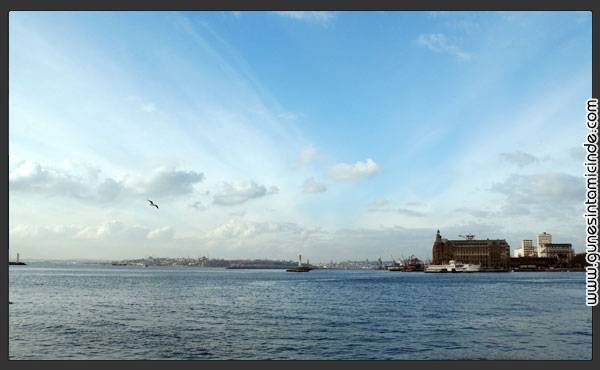 Bu fotoğraf, İstanbul Kadıköy’de yolun karşısından koşarak gelip çekmeme yol açan bir manzarayı barındırıyor. Avrupa yakası üzerinde büyük bir “V” harfi. Böylece hayran kalarak, bir seri fotoğraf çektim. En çok bu pozu beğendim. Geniş açı çekim nedeniyle bükülme hissedebilirsiniz. (Fıçı efekti denen bir yan etki) Ama bunu düzeltmedim. Dünyanın yuvarlaklığını hissettiriyor. Martıyı, şehirhatlarının vapurunu ve efsanevi Haydarpaşa Garı’nı da unutmamak lazım. :)