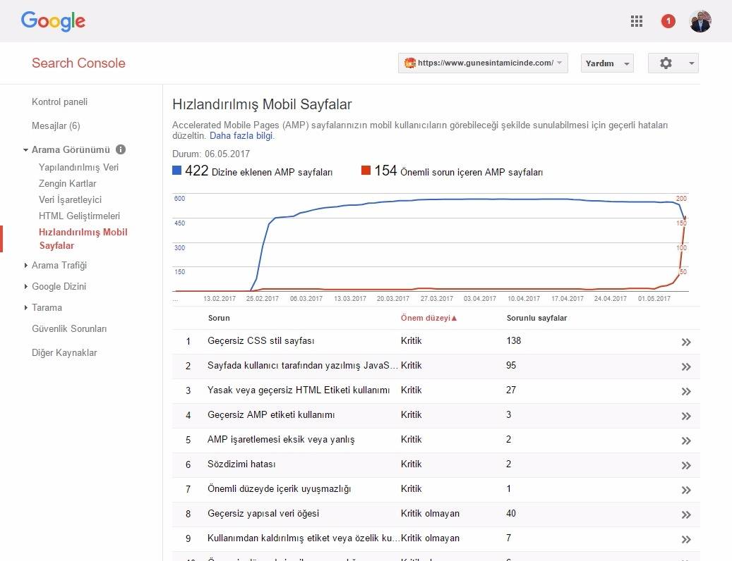 Örnek olması için kendi sitemin daha düzeltim yapmadan ilk AMP Google web tools hata raporunu üstte veriyorum. Elbetteki hataları büyük oranda ayıkladım artık :)