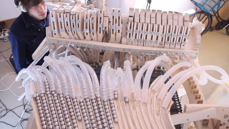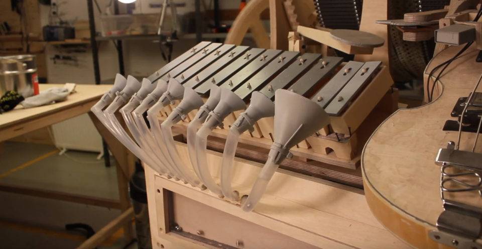 Başka bir parça Vibrafon: Bilyeler düşerken ona çarpıyorlar ve hunilere gidiyorlar. Her biri farklı bir nota.