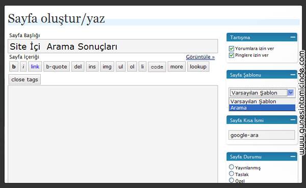 Yeni Sayfa başlığına “Site İçi Arama Sonuçları” diyoruz. Sağdaki “Sayfa Kısa İsmi”ne de yukarıda Google aramaya verdiğimiz “google-ara” yazıyoruz. Yine sağdaki “Sayfa Şablonu”nda biraz önce siteye yüklediğimiz “Arama”yı seçiyoruz. Böylece üçüncü adımda tamamlandı.